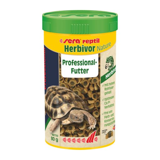 Sera Reptil Professional Herbivor Nature eleség kedvtelésből tartott növényevő hüllők etetéséhez. Lebegő, bicolor granulátumokból álló kiegészítő táplálék. Különféle nyersrostokban gazdag, és tartalmazza a természetes táplálkozási spektrumnak megfelelő gyógynövények keverékét, valamint kisebb mennyiségben a szintén szükséges, jó minőségű fehérjéket és zsírokat is. Fontos vitaminokban, ásványi anyagokban és algákban gazdag, így erősíti az állatok ellenállóképességét. Az optimális kalcium-foszfor arány az egészséges csontozat és páncél növekedésének alapja. Az alacsony hőmérsékleten történő extrudálás által a létfontosságú alapanyagok optimális mértékben megmaradnak. Színezékek és tartósítószer nélkül. Kiszerelés 250 ml, nettó 80 g.