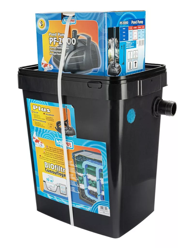 A Camouflage kivitel lehetővé teszi, hogy a szűrőt diszkréten elrejtsük a kertben. A csőcsatlakozók magasságáig a talajba süllyeszthető, így a berendezés kevésbé látható, miközben a teljes szűrési kapacitás megmarad. A készlet egy Happet PF-2000 vízpumpát és 4 méteres gégecsövet is tartalmaz, így a rendszer gyorsan és egyszerűen üzembe helyezhető.